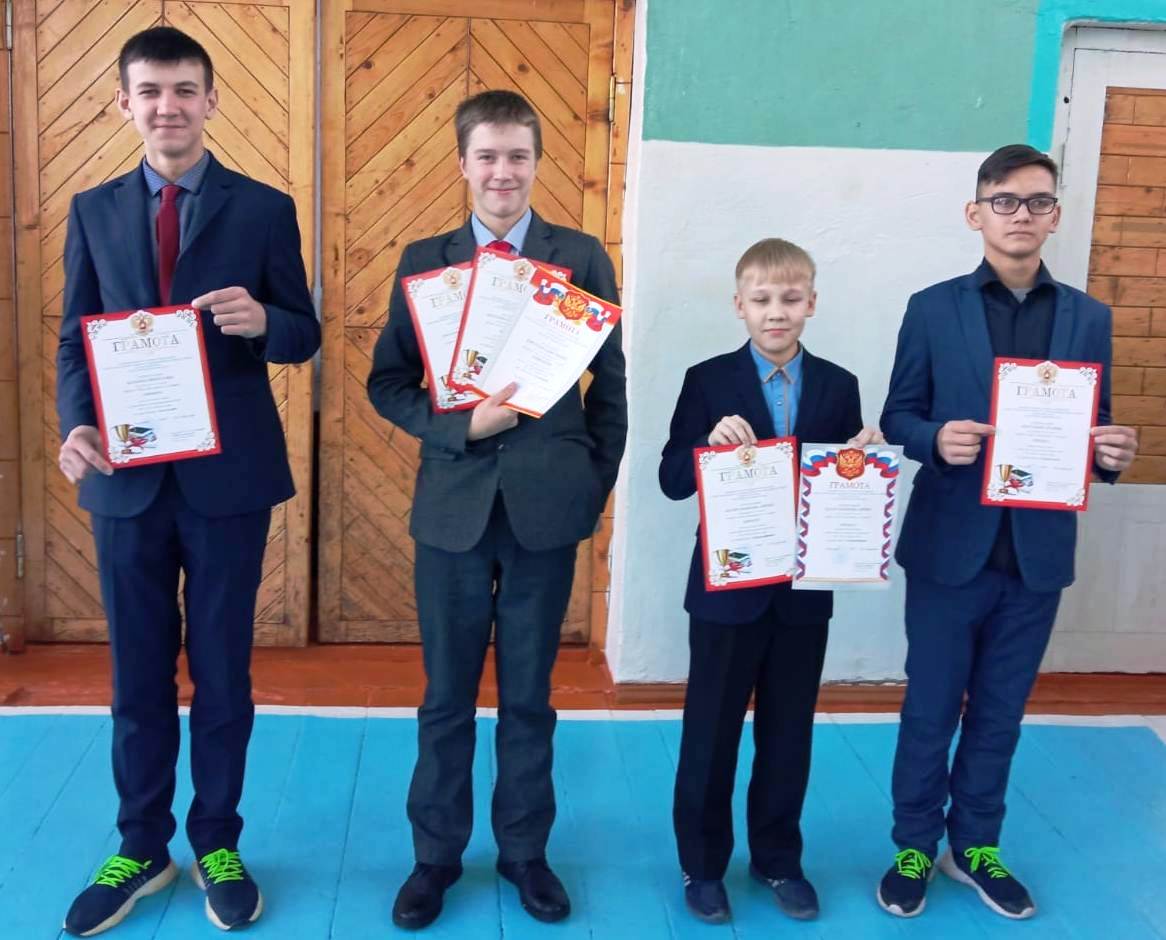 Слева направо: Жданов Вячеслав (8 класс) - призёр муниципального этапа ВОШ по экологии, Пастухов Константин (8 класс) - победитель муниципального этапа ВОШ по технологии и призёр муниципального этапа ВОШ по биологии и обществознанию, Бесштанников Артём (7 класс) - призёр муниципального этапа ВОШ по математике и литературе, Шестаков Матвей (8 класс) - призёр муниципального этапа ВОШ по технологии.