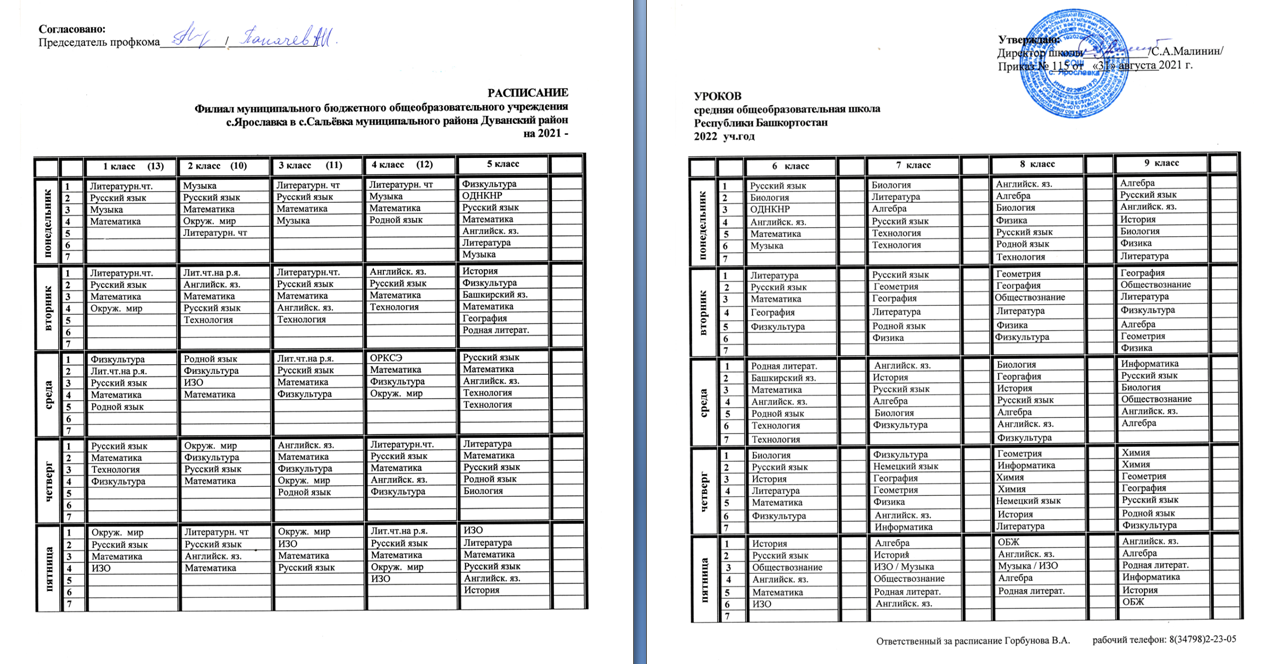 Расписание уроков на 2021 - 2022 учебный год