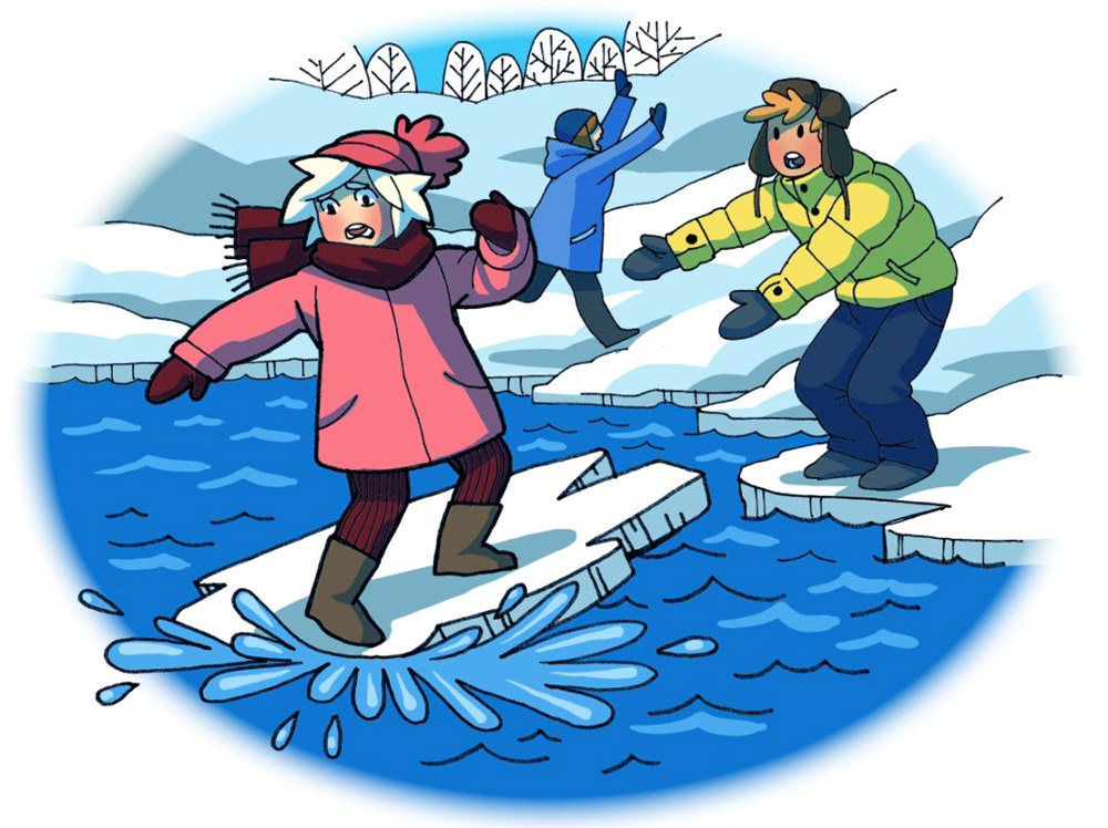 Нельзя ходить по ледяному покрову или испытывать его прочность ударами ног. Лед под ногами может неожиданно проломиться, и вы окажетесь в ледяной воде.
