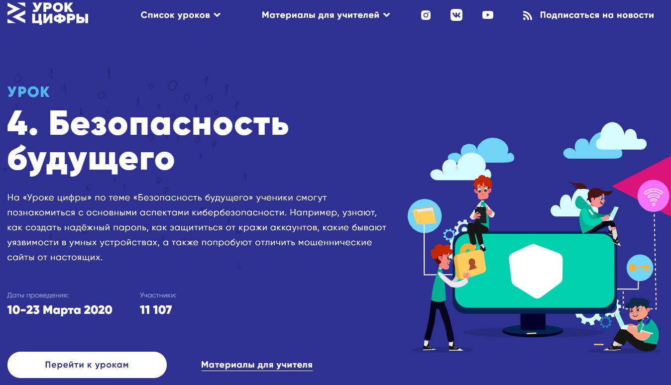 В период с 10 по 23 марта 2020 года проводится Всероссийское образовательное мероприятие "Урок цифры" по теме "Безопасность будущего". В нашей школе приняли участие учащиеся с 7 по 9 классы. Было проведено три мероприятия. Общее количество участников — 24 ученика.